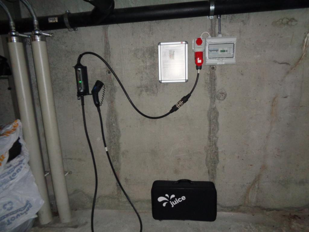 • Das erste Elektroauto in der Tiefgarage wird mit einem JuiceBooster wie unten abgebildet geladen.